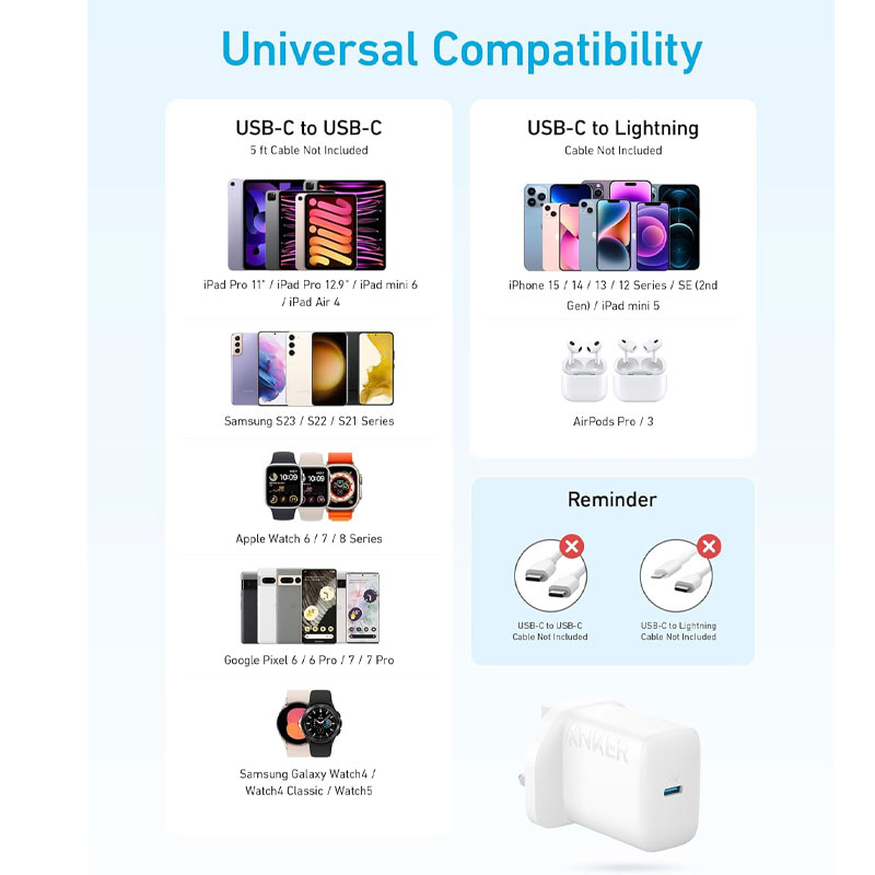آداپتور ۲۰ وات ANKER کاملا مناسب برای سری آیفون های ۱۲ ۱۳ ۱۴ ۱۵ ۱۶ میباشد که برای تمام مدل ها کاملا به صورت استاندارد با استفاده از سیستم ایمنی MultiProtect Anker تضمین میکند که دستگاههای شما در برابر خطرات احتمالی محافظت میشوند و تجربه شارژ بدون نگرانی را برای شما فراهم میکنند.