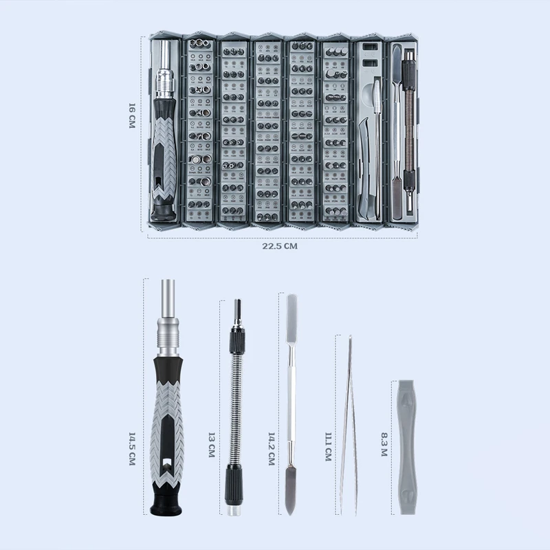 تعداد ابزار‌ها ۱۲۶ عدد شامل ۱۲۰ سری پیچ‌گوشتی و ۶ ابزار جانبی کاربردی