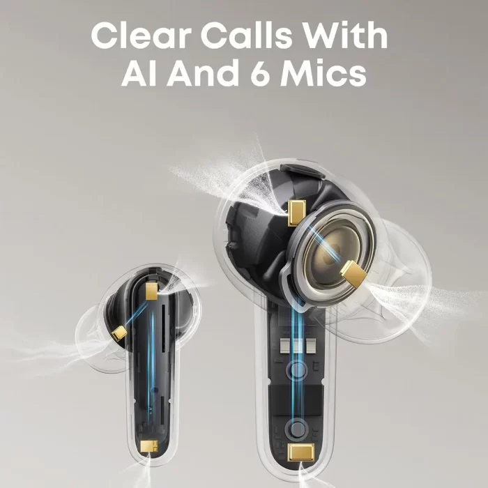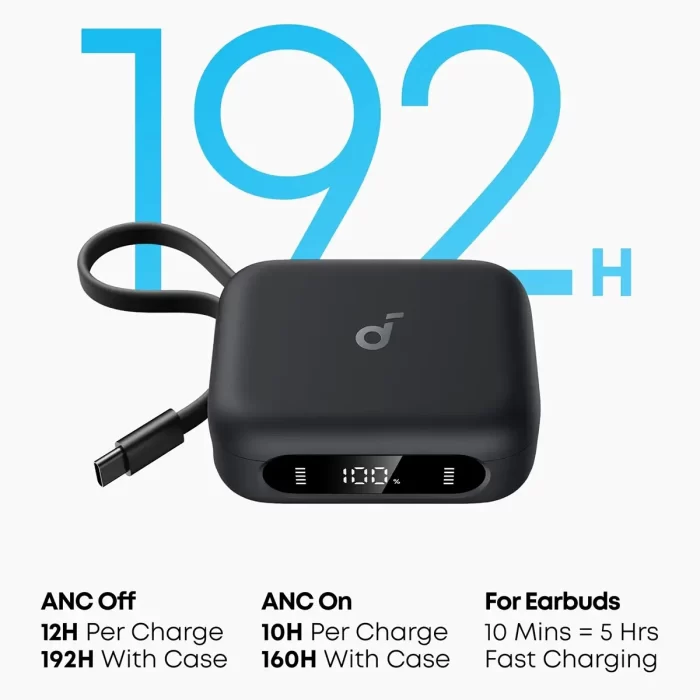 باتری یکی از نقاط قوت برجسته Soundcore P41i است که آن را به یک “ماراتندو” واقعی تبدیل میکند. هر هندزفری به تنهایی تا ۱۲ ساعت پخش مداوم با ANC خاموش ارائه میدهد – عددی که در مقایسه با رقبا مانند AirPods Pro 2 (۶ ساعت) بسیار چشمگیر است. با کیس شارژ، این زمان به ۱۹۲ ساعت میرسد! کیس با باتری ۳۰۰۰ میلیآمپرساعتی نه تنها هندزفریها را شارژ میکند، بلکه میتواند یک iPhone 16 Pro را تا ۵۰% یا Samsung Galaxy S24 را تا ۴۵% شارژ کند. شارژ سریع هم فراموش نشده: فقط ۱۰ دقیقه شارژ، ۵ ساعت پخش اضافی به شما میدهد. اتصال بلوتوث ۵.۳ پایدار با برد تا ۱۰ متر، اتصال چندنقطهای (Multi-Point) برای جابجایی بین دو دستگاه (مثل گوشی و لپتاپ) و جفتسازی سریع Google Fast Pair را پشتیبانی میکند. در زمینه تماسها، شش میکروفون با الگوریتم AI Noise Reduction صدایی واضح و بدون نویز پسزمینه ارائه میدهند – ایدهآل برای تماسهای کاری یا چتهای ویدیویی.