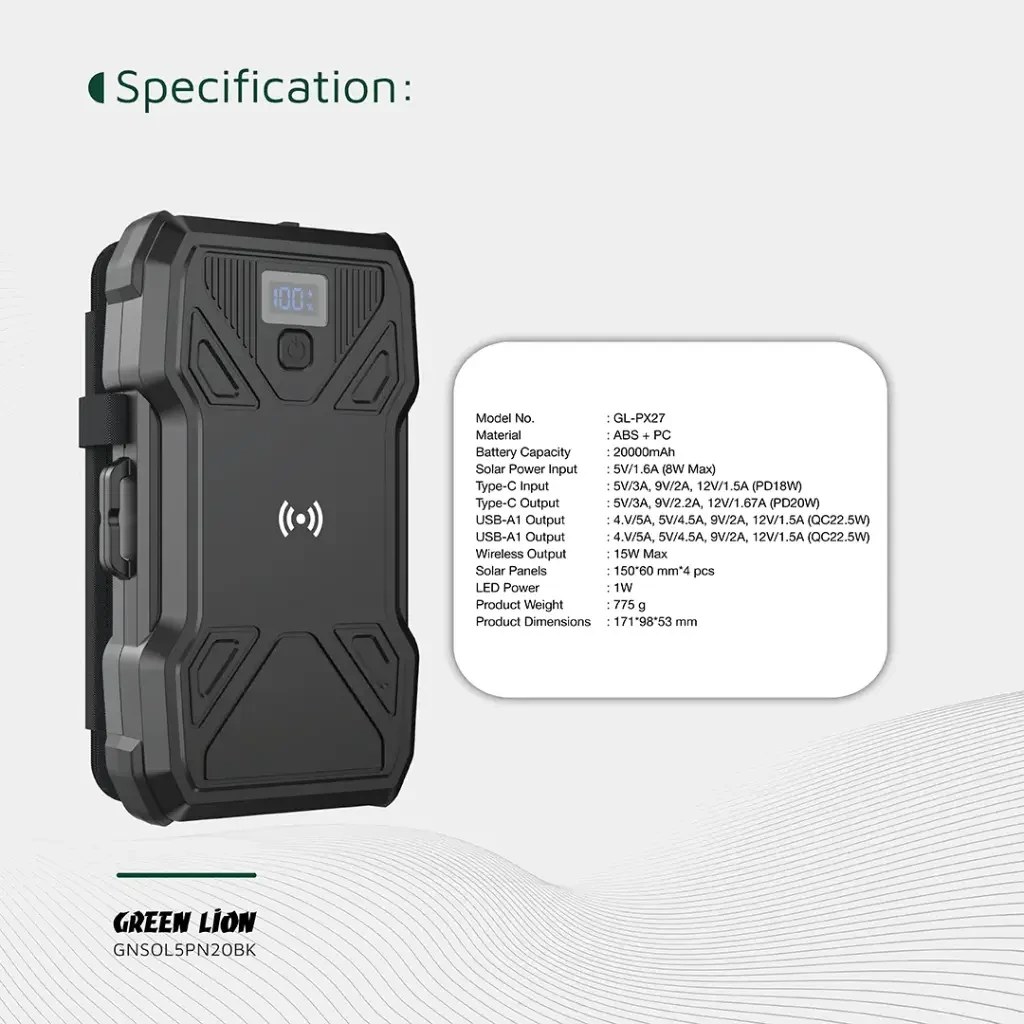 ویژگیهای کلیدی پاوربانک خورشیدی گرین لاین GL-PX27